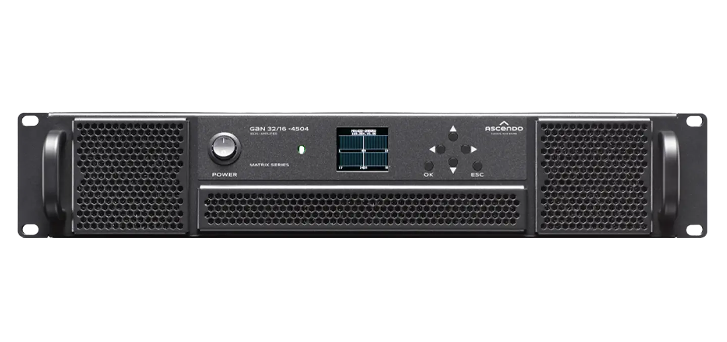 The GAN Series is ASCENDO’s comprehensive series of multichannel amplifiers for high-performance audio applications in markets where high channel count is required. Energy conservation is a major design goal for this range of products, which directly impacts CO2 emissions.