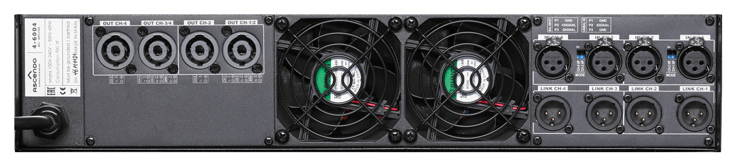 230 V @ 4 Ω: 4 x 1500 W 230 V @ 8 Ω: 4 x 800 W