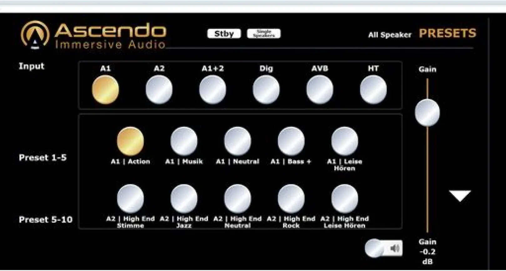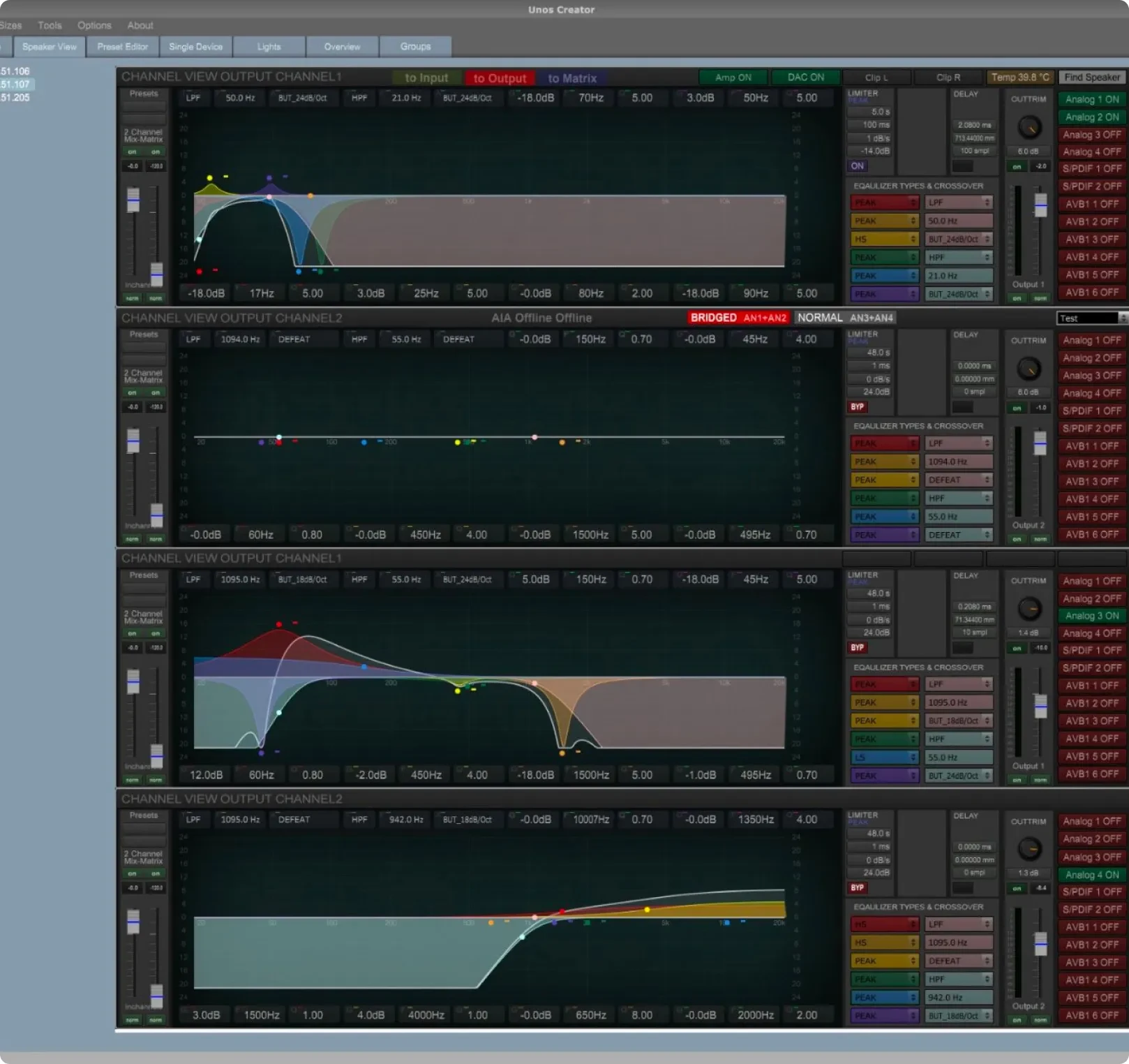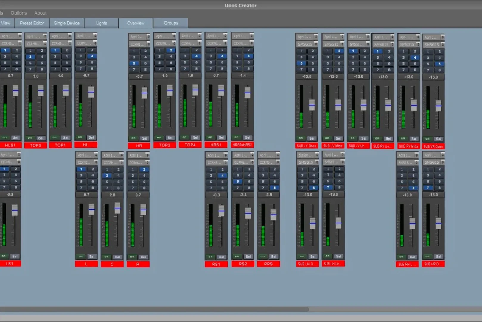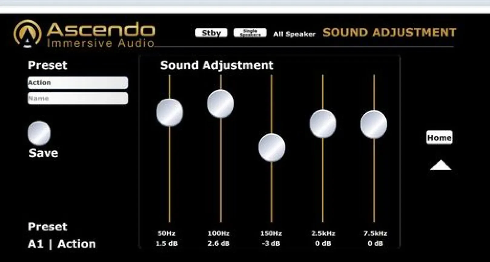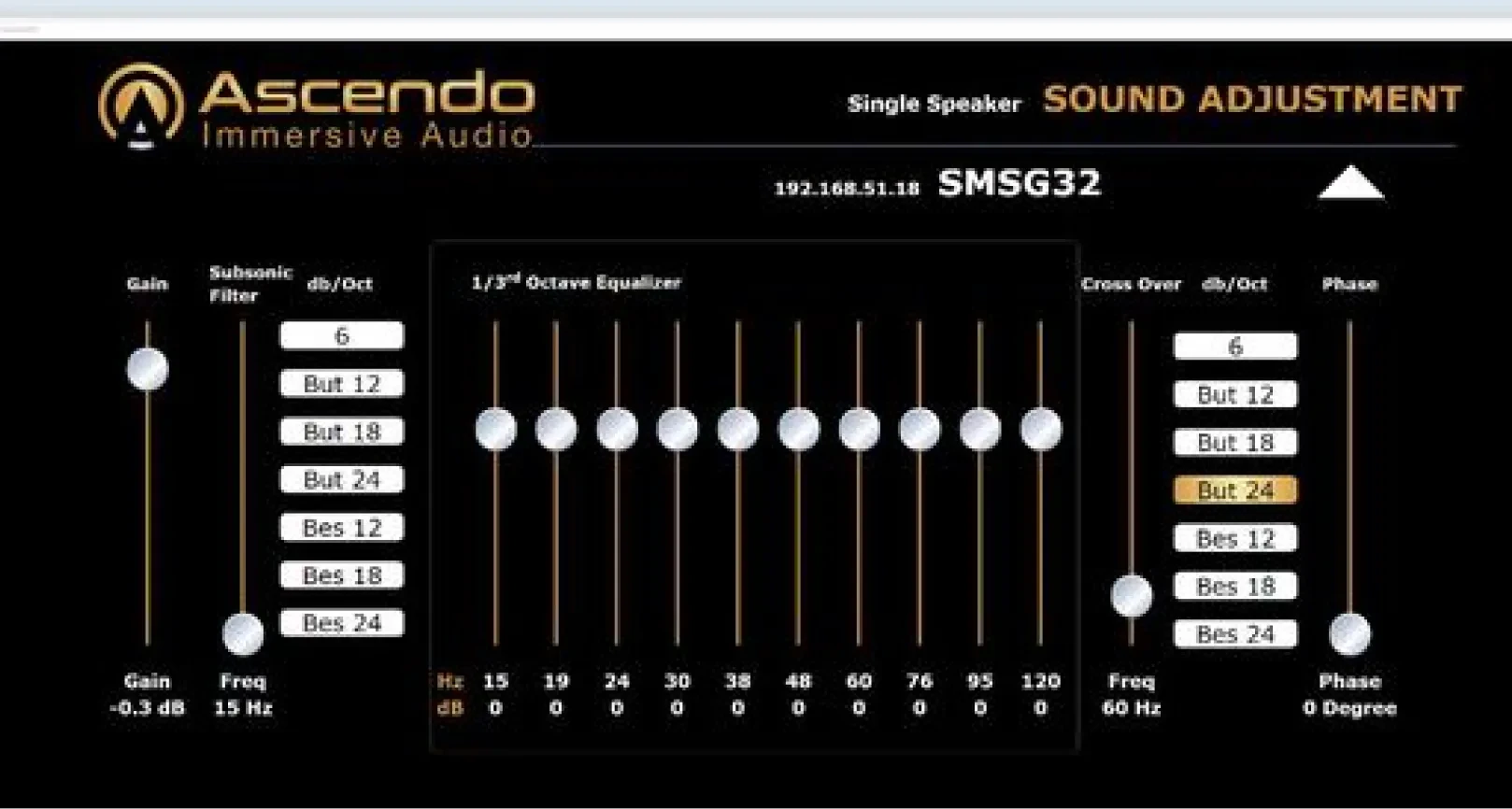 The AIA Creator TM software connects with all active speakers, subwoofer,s and external amplifier modules. They can be combined into one system controlling master and group functions as well as all millions of individual parameters in real-time. Systems can exist of single up to huge Immersive home theater or networked audio over IP systems. Each speaker comes with powerful internal audio processing and multiple preset memory functions. Those DSP functions are meant to compensate for room correction and speaker alignments. Useful functions such as level and gain adjustment, delay time, matrix routing, bass management, and speaker group voicing can be performed at different user levels. Naturally, also standard settings as X-curve calibrations or specific loudness curves can be stored in each speaker. AVB streams could be split to double up on a surround channel with different time alignment, retrieve other preset settings switching between different surround formats such as Dolby Atmos, DTSX Pro, or Auro3D, or change the setup for various listening positions altogether, which becomes easy.