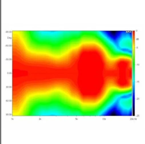 This results in symmetry of response on both the horizontal and vertical axis, at any given angle. The crossover transition is seamless (inaudible) at all angles. (By “symmetry,” we mean that whatever response is observed at a given angle with respect to the axis, the same response will be observed at that angle in the opposite direction. The loudspeaker’s behaviour is “mirrored” about its axis.) Non-coaxial loudspeakers are not able to display this symmetry.
