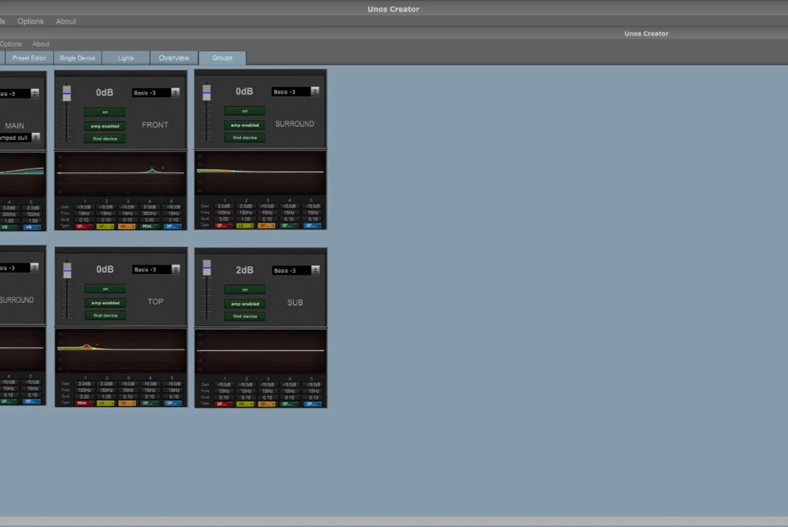 The Main groups assign to all connected speakers the same changes. If, for example, a recording sounds too dull, the Main group containing all loudspeakers has its treble level raised and the fundamental range lowered. All amplifiers are switched on and off via the Main group. Often, however, only specific cinema speakers need to be changed. For example, all subwoofers are required to play louder and/or the ceiling speakers have to perform a bit more powerful, in order to let the thunderstorm seem more realistic. These changes are effected in the subgroups Front / Surround / HiSurround / Top / Sub. With the Group function, even very large installations can be easily and orderly adapted to the existing room acoustics, as well as to the different requirements of different film genres, recording qualities, and surround formats. The real-time control makes it possible to make all changes instantly noticeable and also to facilitate the operation.
